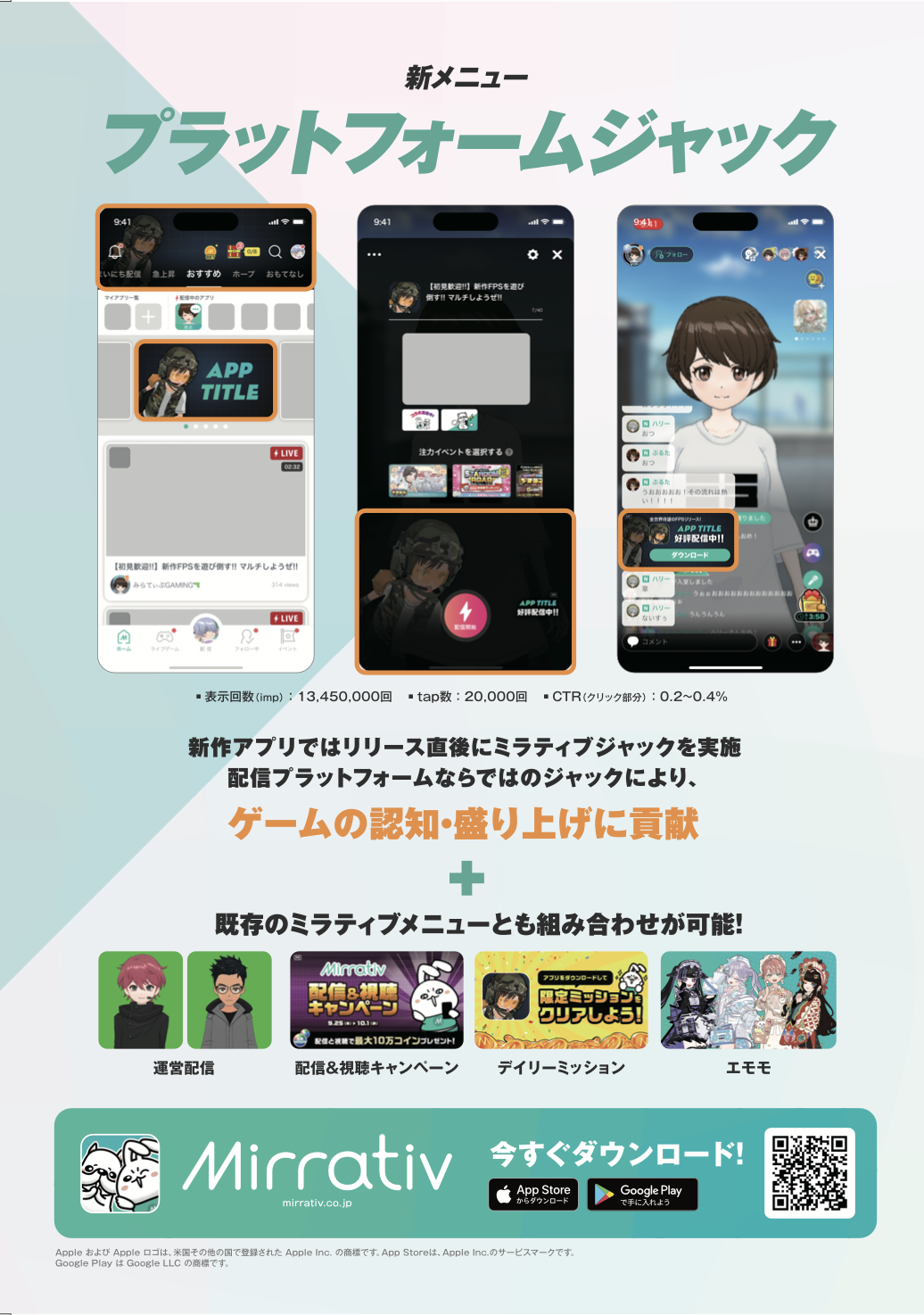 ブースでは、これまでのMirrativ広告の事例はもちろんのこと、新たにリリースいたしました広告メニュー「プラットフォームジャック」についてもご紹介を行う予定です。